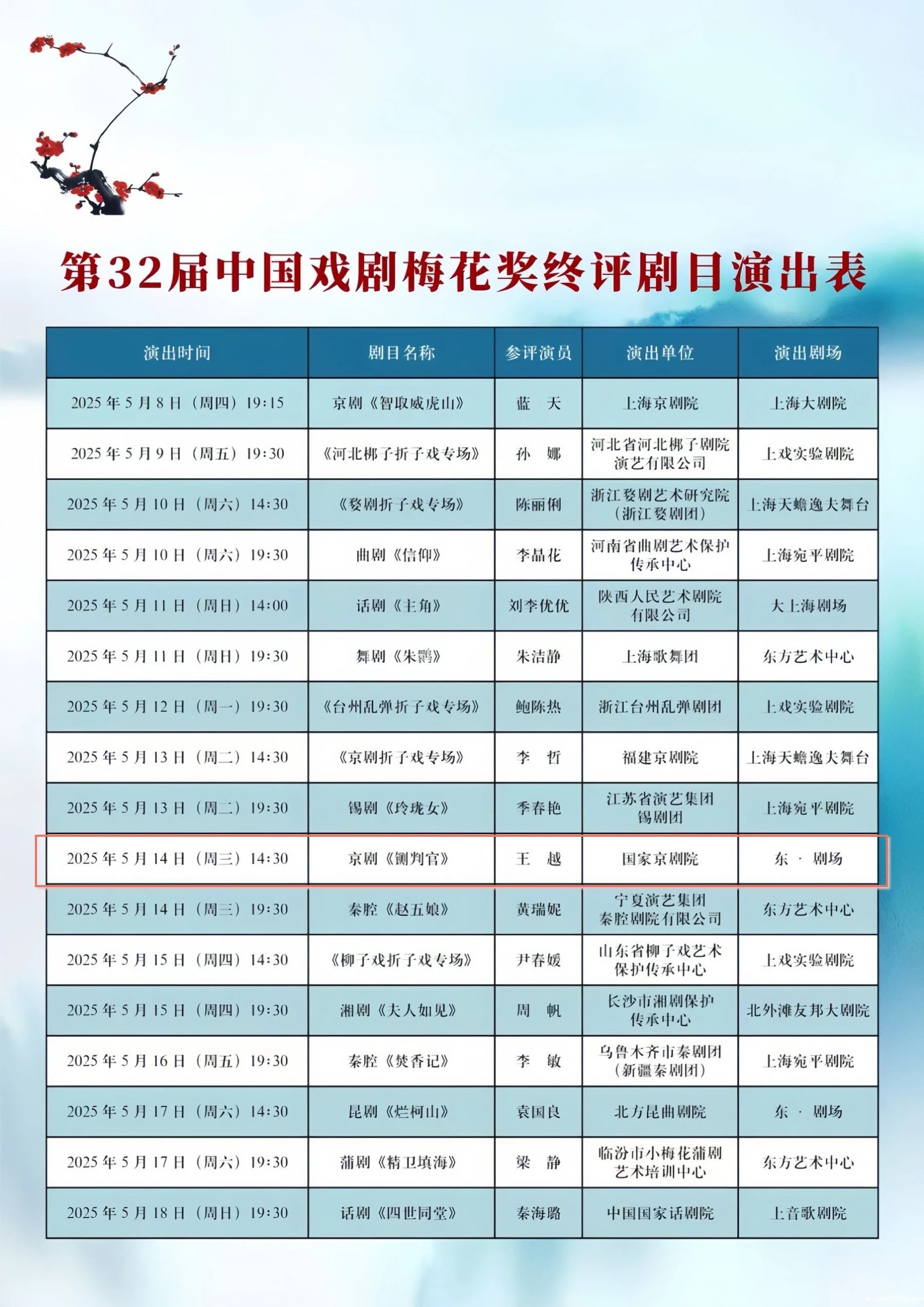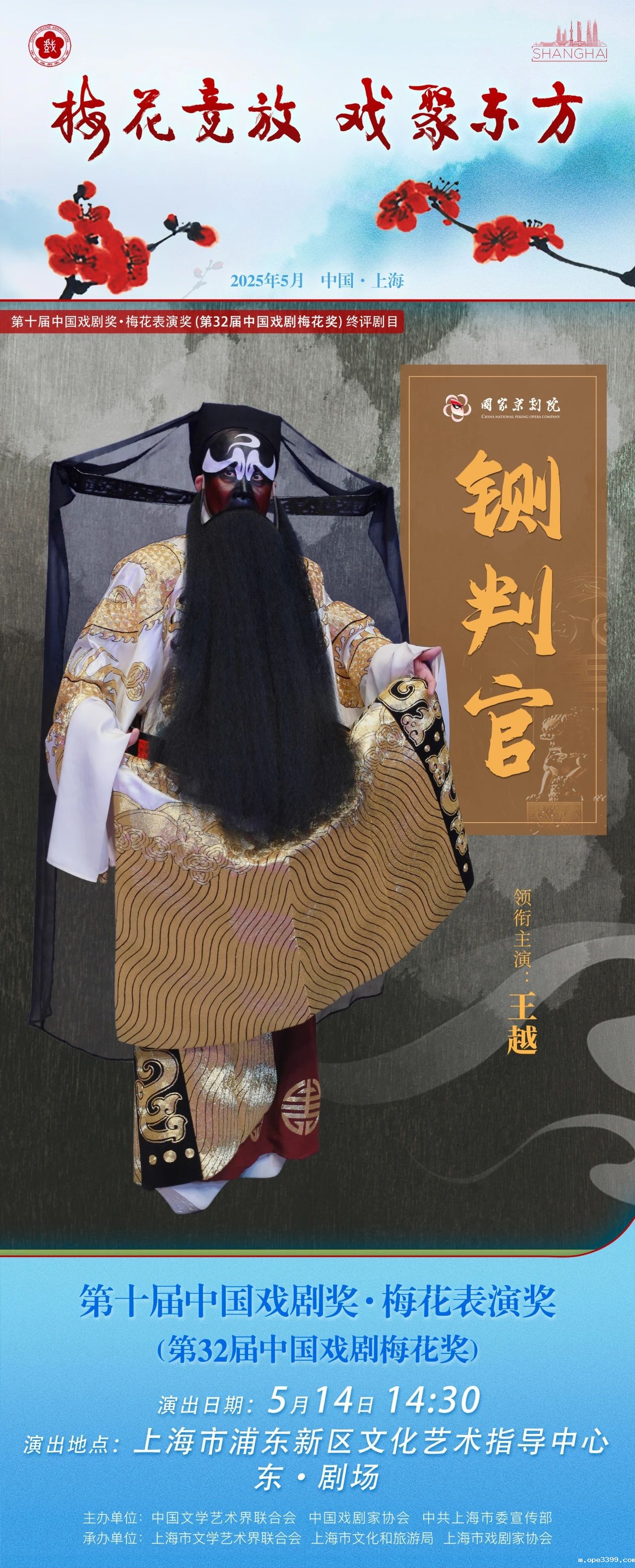 中国戏剧梅花奖是由中央批准,中国文联、中国剧协共同主办的中国戏剧表演艺术最高奖。由中国文联、中国剧协、中共上海市委宣传部联合主办的第十届中国戏剧奖·梅花表演奖(第32届中国戏剧梅花奖)终评活动将于2025年5月8日至21日在上海隆重举办。活动将以“梅花竞放戏聚东方”为主题,除了17台终评剧目集中展演外,还将开展34场演前导赏及演后谈、1场主题研讨会、1场获奖演员惠民演出等系列活动。梅花奖终评将以剧目现场展演的形式进行。经终评评委现场观摩后,差额评出15名获奖演员,结果将于5月21日晚举行的“中国戏剧梅花奖、曹禺戏剧文学奖颁奖晚会”上,与第26届曹禺戏剧文学奖的5部获奖剧作一同揭晓。
